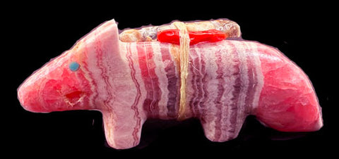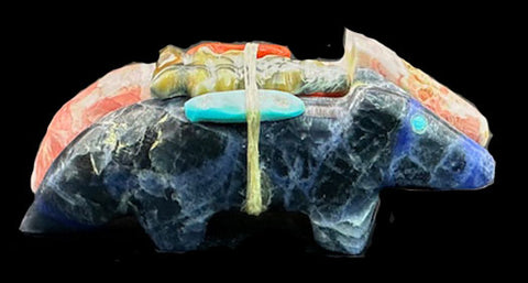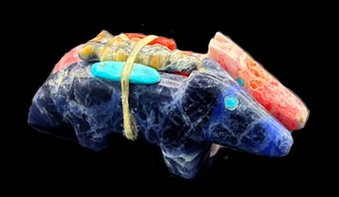 This exquisite Zuni fetish features two beautifully carved wolves-one from rich pink rhodochrosite and the other from deep blue sodalite, each inlaid with brilliant turquoise eyes that lend them a lifelike presence. The wolves stand together, symbolizing unity, loyalty, and life long partnership- a timeless representation of mates for life.